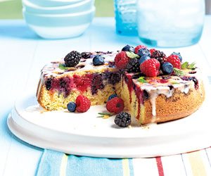 3. Bake 40 to 45 minutes or until pick inserted near center comes out clean. Cool cake in pan 5 minutes. Run knife around edge of the pan to loosen sides . Invert. Remove parchment. Top with remaining berries, basil and mint. Makes 10 servings