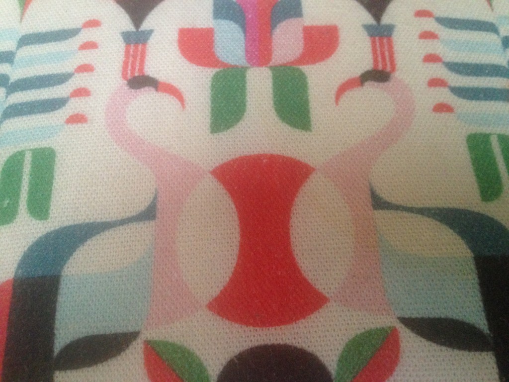 There I was staring at this lovely cushion and the images started to come alive. There was the sun, the flowers, the birds, the temple, the trestle table…but it was the flamingos that captured my imagination and spoke out to me today.