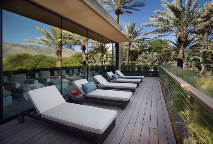 The massive stucco walls of the spa are colored the rich tone of mesquite bark, blending into the desert. A huge glass wall offers spectacular views of the Catalina Mountains. To the side of the reception desk, light flickers mysteriously, casting shadows over a graphite glass wall, from a lit water trough at its base. A vast corridor lined with aged reclaimed cedar leads to the spa treatment rooms.