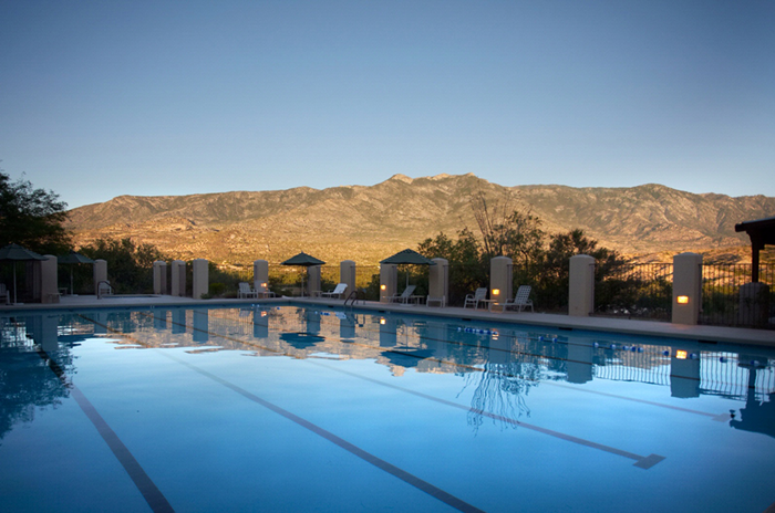resources, products and furnishings made from sustainable materials. A sensual combination of design and natural elements stir the senses as you approach the spa from the resort. The walkway to the spa leads to a long reflecting pool of water which reflects the Arizona sky, where you are also greeted by the heavenly scent of sage, wild lavender and deer grass. An intimate view of the Catalina Mountains, fortifying in its beautiful simplicity is on view from a plush chaise, the ever-changing sunset reflected on the huge glazed wall. In the evening, a fire bowl is lit to add to the harmonious atmosphere.