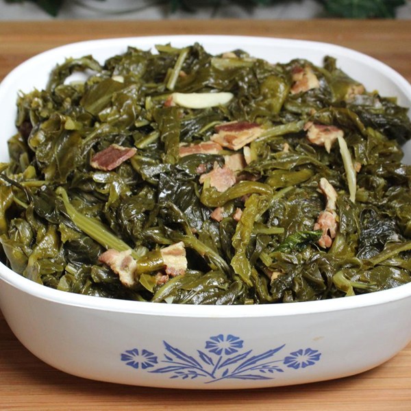 Cook bacon in a 10-qt. stockpot over medium heat 10 to 12 minutes or until almost crisp. Add onion, and sauté 8 minutes. Add greens and enough chicken broth to cover the greens cook the greens down, cover, reduce heat to low, and cook for 1 1/2-2 hours.