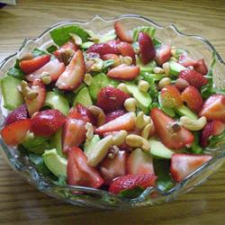 Place the salad greens in a pretty bowl, and top with sliced avocado and strawberries. Drizzle dressing over everything, then sprinkle with pecans. Refrigerate for up to 2 hours before serving, or serve immediately.
