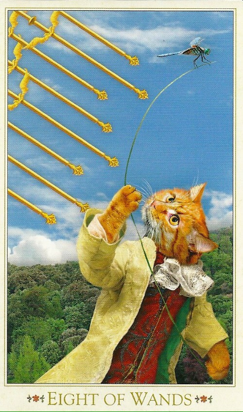 One of the ways the 8 of Wands can be interpreted is arrows of love, especially after having the Ace of Cups yesterday. Be on the lookout for those arrows, as they may not be wanted, after all Mercury is retrograde and someone from your past may try to contact you. So, you may be ducking those arrows, or perhaps you are a willing target. Either way, be aware.