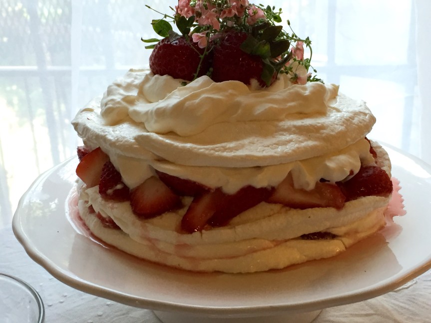 Normally I don’t post 2 days in a row, but today is the summer soltice which happens to also fall on the same day as the full moon, the strawberry moon, a once in a lifetime occurrence the last time this happened was in 1948, so to celebrate I made Pavlova, an ethereal, light and beautiful dessert, I used strawberries in honor of the strawberry moon and they happen to be at their peak now. I’ve never made one before, I’ve seen them all over blogs and food websites and it’s been on my bucket list for a while now. After making the rhubarb cordial I have been thinking of different ways to use it besides in drinks. This dessert came to mind, pavlova with strawberries that are macerated in the rhubarb cordial piled onto the meringue layer and topped with whipped cream that is gently flavored with elderflower. I found so many recipes online…