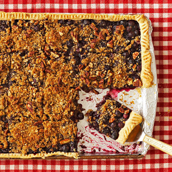 Bake for 40 to 45 minutes or until filling is bubbly and topping is golden. (If necessary to prevent over browning, loosely cover top of pie with foil the last 10 minutes of baking.) Cool slightly in pan on a wire rack. Serve warm or cool completely. Use foil to lift uncut pie out of pan. Place on cutting board; cut into rectangles.