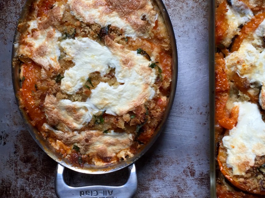 This is not a traditional eggplant parmigiana, I used what I had a ton of tomatoes and one large eggplant. I usually bread the eggplant and fry it but not this time, it’s a little different. Yesterday I oven roasted 3 baking sheets of tomatoes that I got at the farmers market. I bought an eggplant that I thought I would try to spiralize, it was too big and spongy and the spiralizer didn’t work on it. Cleaning out my freezer I found a small bag of bread crumbs (about 1 cup) that I had made from homemade bread that didn’t get eaten. So if you can see where I’m going I used what I had in the refrigerator and freezer and created a delicious casserole. The eggplant was cut into about 1/4 inch thick slices and roasted in the oven with a drizzle of olive oil. Layer the tomatoes and eggplant…