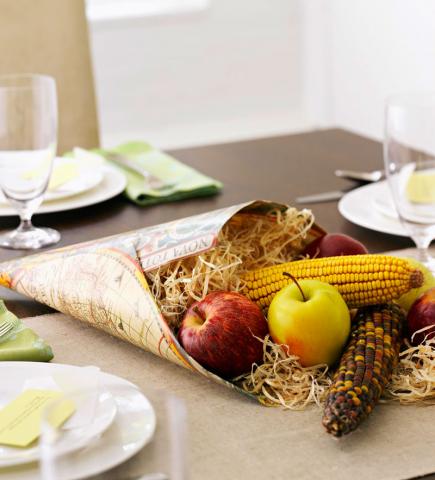 Instead of the traditional wicker cone, make your own cornucopia from wrapping paper by folding into a cone shape and securing with tape. Fill with shredded paper and arrange fruits and vegetables.