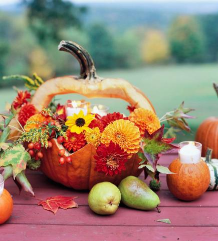 A creatively cut pumpkin “basket” makes an imaginative centerpiece for a fall table.