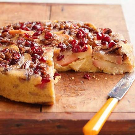 butter melts. Bring to boiling. Remove from heat. Stir in milk. Sprinkle with pecans and cranberries. Arrange apple slices on top.