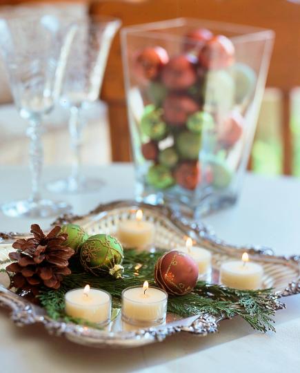 A fancy vintage silver tray becomes a standout centerpiece when dressed with glowing tea lights, several glitzy ornaments, fresh cedar branches and a single pine cone.