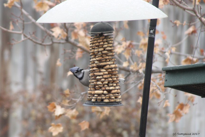 As I mentioned the other day, we may have witnessed signs of an early Spring. I say that, and you know – it then snows in April. Always on your toes, I say! Despite the freezing temperatures, my attention was drawn to the neighbors yard were I could hear Blue Jays cawing (for lack of a better word). Usually that means one thing – they have claimed ownership of the bird feeder and are now warning everyone nearby to shove off.