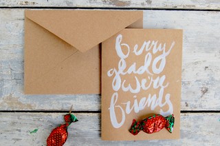 3. Make kraft paper cards for friends. These homemade valentines are easy and economical. Use white paint or a paint pen to write your message on plain kraft paper cards, and finish with a berry candy.
