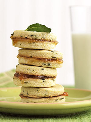 5. Snip any large pieces of fruit in apricot preserves. Spread the bottoms of cookies without sage leaves with preserves. Top with sage-topped cookies, flat sides down. Makes 16 sandwich cookies.