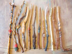 Trees have always played a significant role in Jensen’s work. Whether the trees she paints are with or without blossoms, the branches and trunk, always the centerpiece of her paintings, are emblematic of strength and power. Fluid lines and bursts of color in acrylic, sometimes bold and sometimes faint, chart the trees through seasons or environmental concern. Winter Soul depicts a towering tree with a full head of red blossoms. While Tree of Life shows a trunk that twists and turns into an infinite loop of branches as it basks in the sun. Then there are the beautiful, ornate wands that Jensen has created from tree branches, and incorporating other earthly elements such as gemstones in her magical offerings.