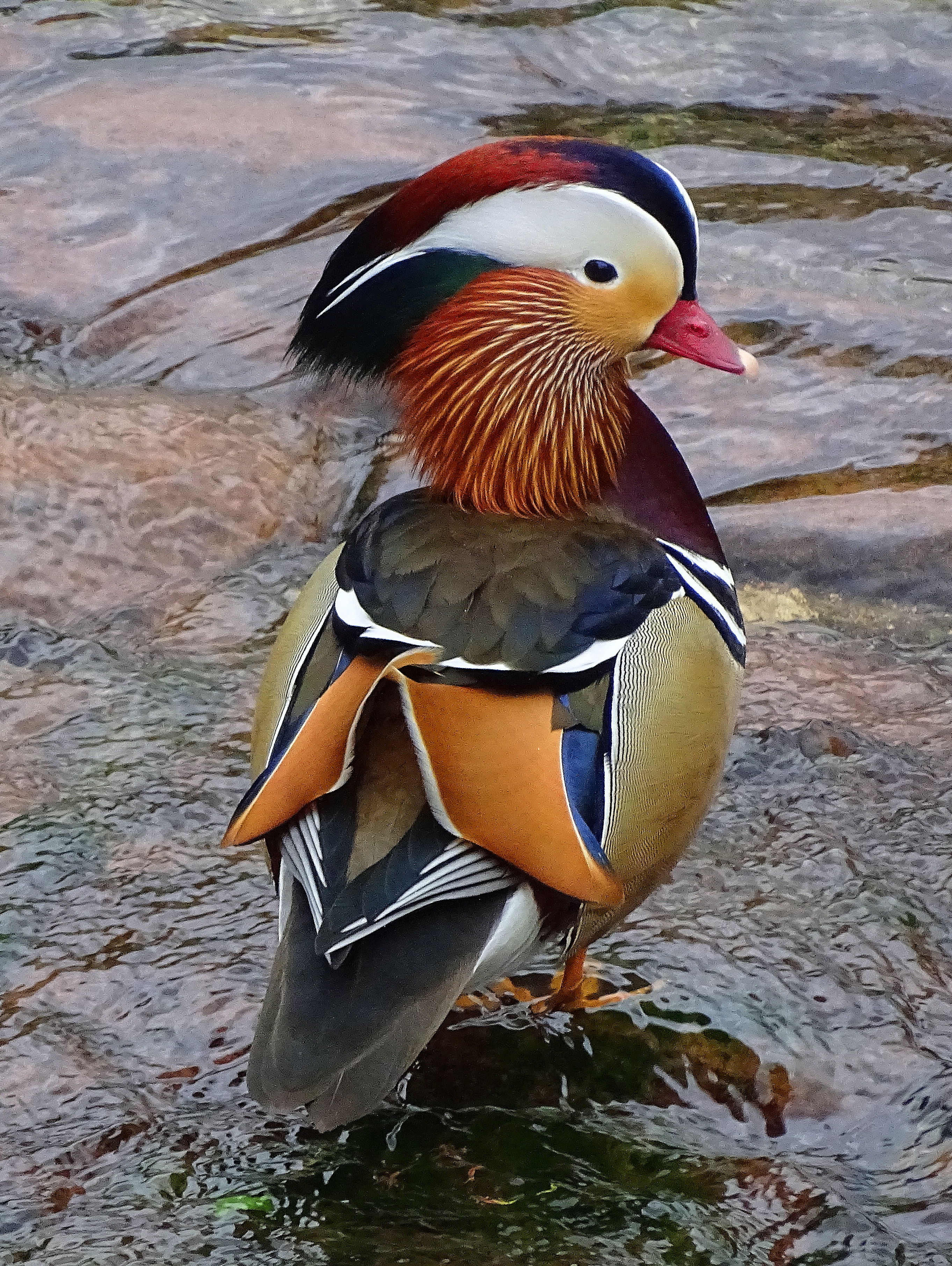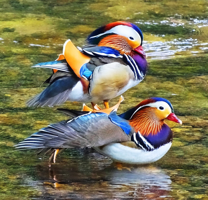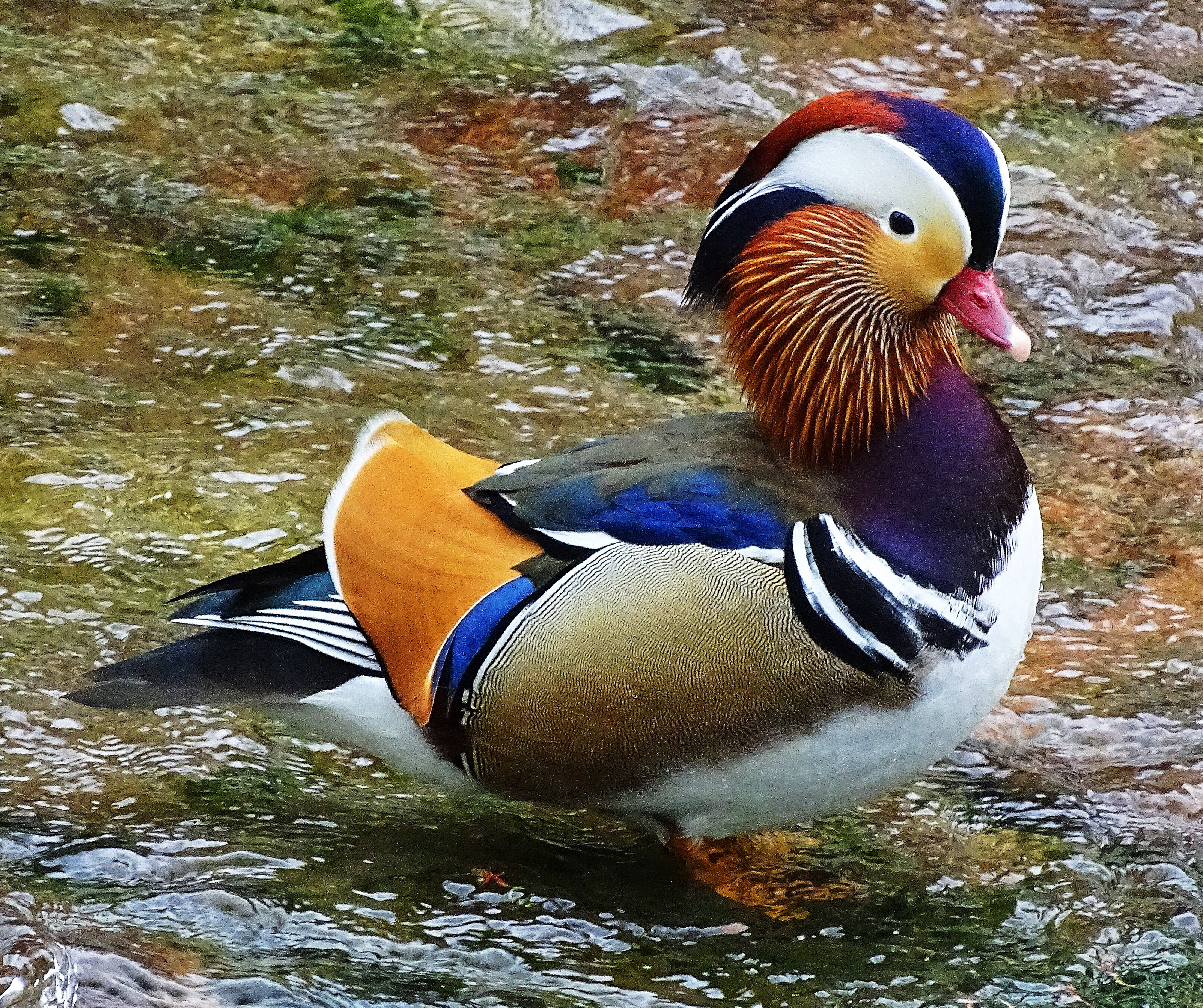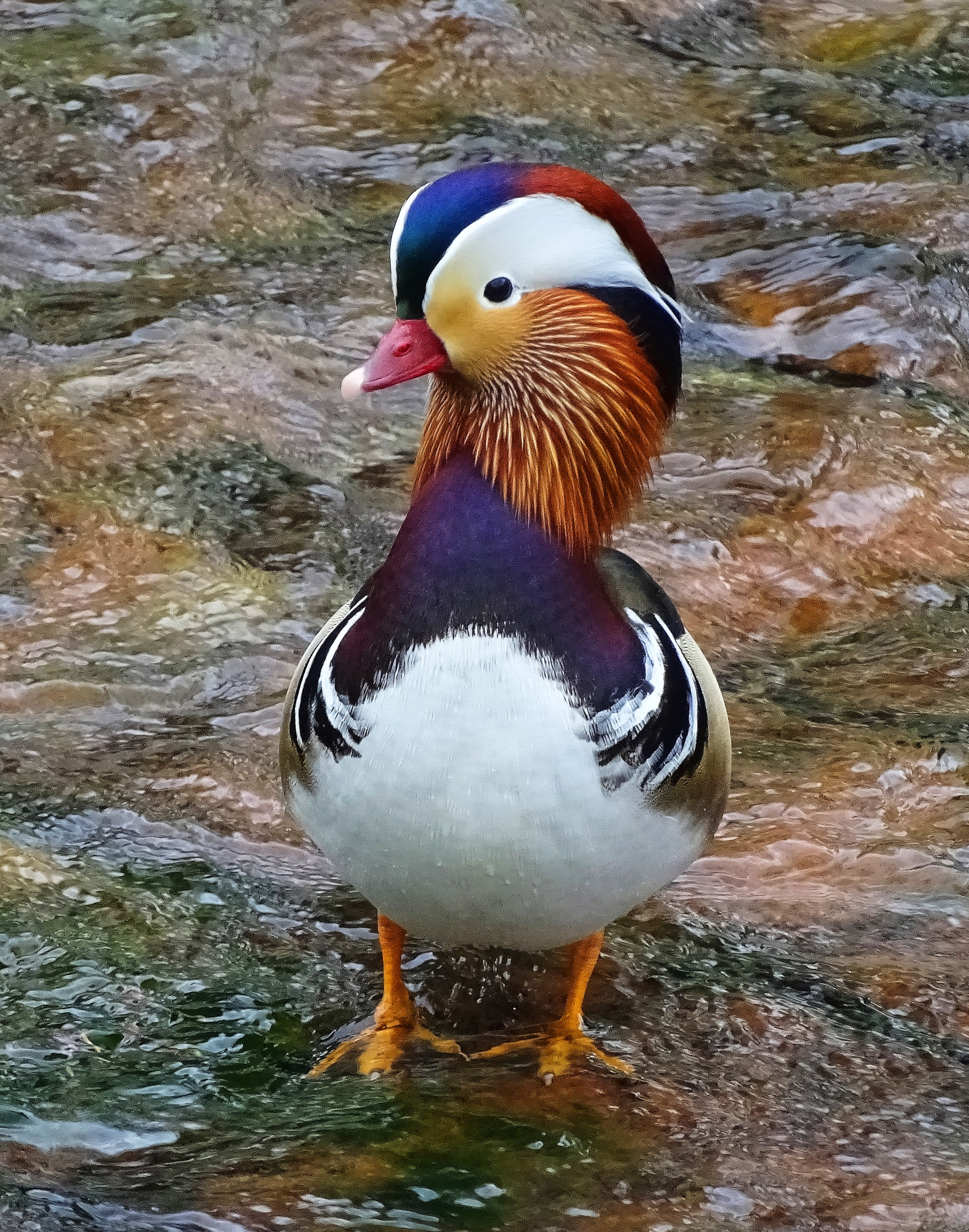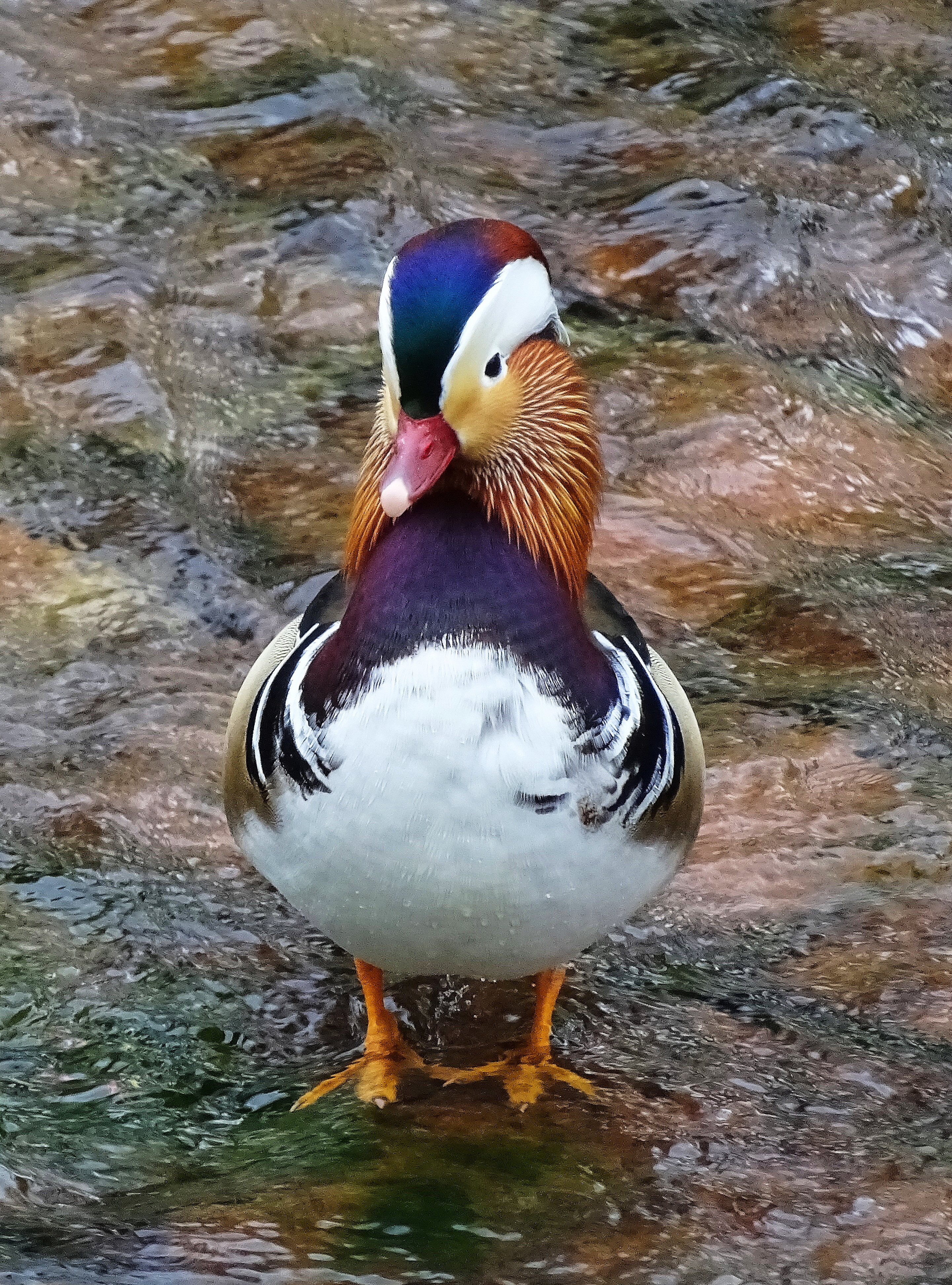 Although Mandarin Duck population numbers are dwindling in their native Russia and Asia, some escapees from captivity are breeding in the wild in Germany and The UK. I happened upon these guys today on the Oos River in Baden-Baden Germany.