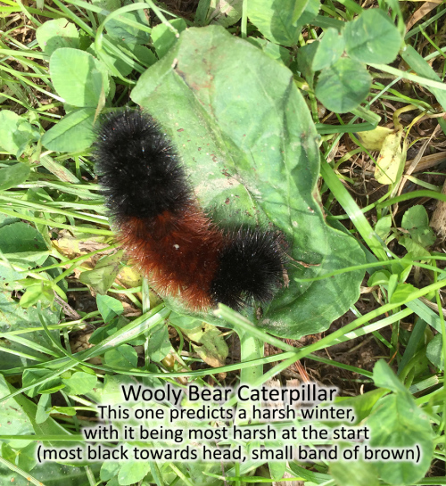 These caterpillars, not unlike other famous wildlife in the area, have long been known to predict the harshness of winter. If a wooly bear caterpillar has more brown than black, that means the winter is mild. But, if the caterpillar has more black than brown, the winter will be tough. Here’s a graphic I made to share this wooly bear caterpillar…