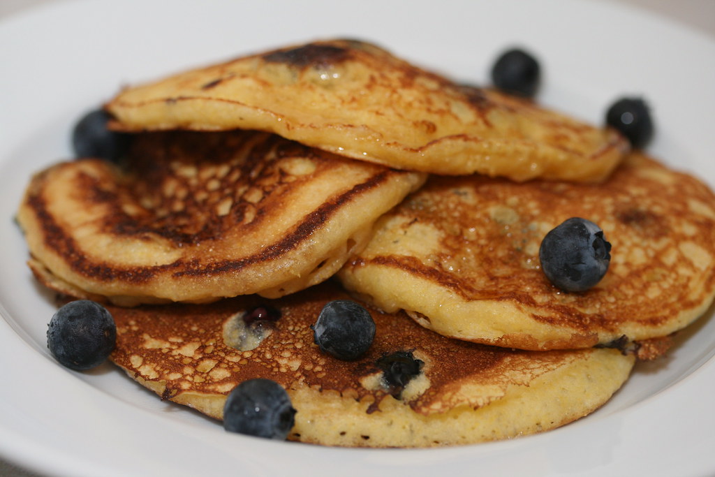 Cook pancakes until bottoms are golden brown and bubbles form on top, about 2 minutes. Turn pancakes over. Cook until bottoms are golden brown, about 2 minutes. Transfer pancakes to the large baking sheet. Place pancakes in the oven to keep warm. Repeat with remaining batter and blueberries, adding more butter to skillet as necessary.