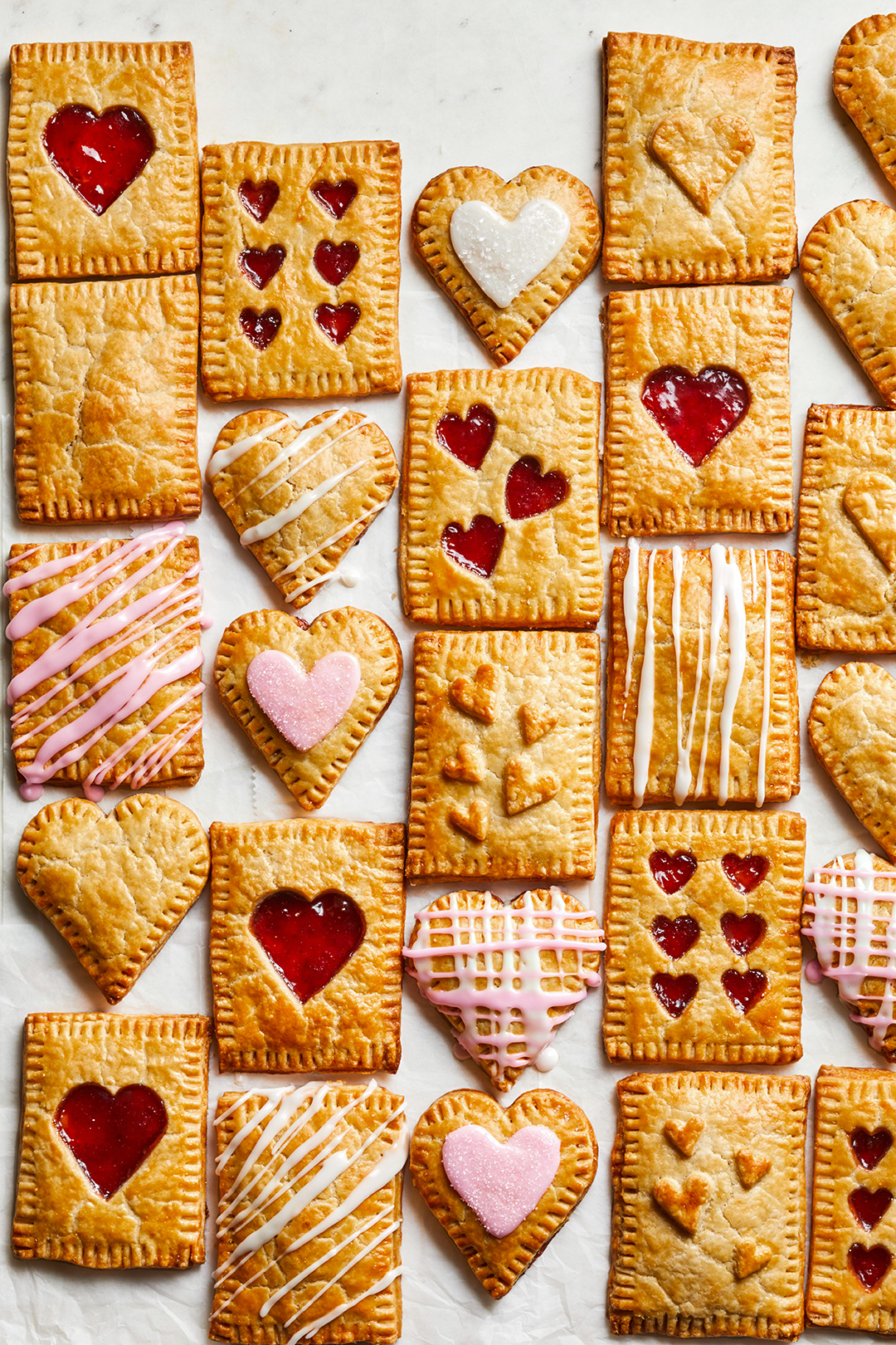For pastries with heart cutouts: Using 1/2- to 1 1/2-inch heart-shaped cookie cutters, cut shapes from half the rectangles. Discard hearts or brush with milk and press onto rectangle tops. Continue as above. For heart-shaped pastries: Roll pastry to 1/8-inch thickness. Cut out shapes using a 3-inch cookie cutter, rerolling scraps. Spread 1 tsp. jam onto half the hearts; add tops. Continue as above. Makes 16 hearts.