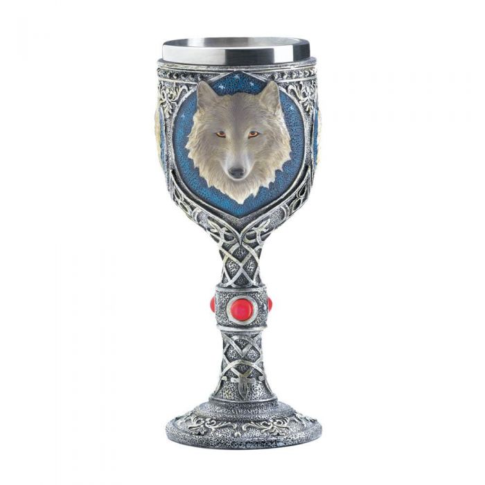 Cheers to the majestic wolf! This beautiful timber wolf goblet features a cool Celtic design, and the centerpiece of the cup is the beautiful wolf bust set on a glorious blue background. Bright red jewels adorn the stem of the goblet.